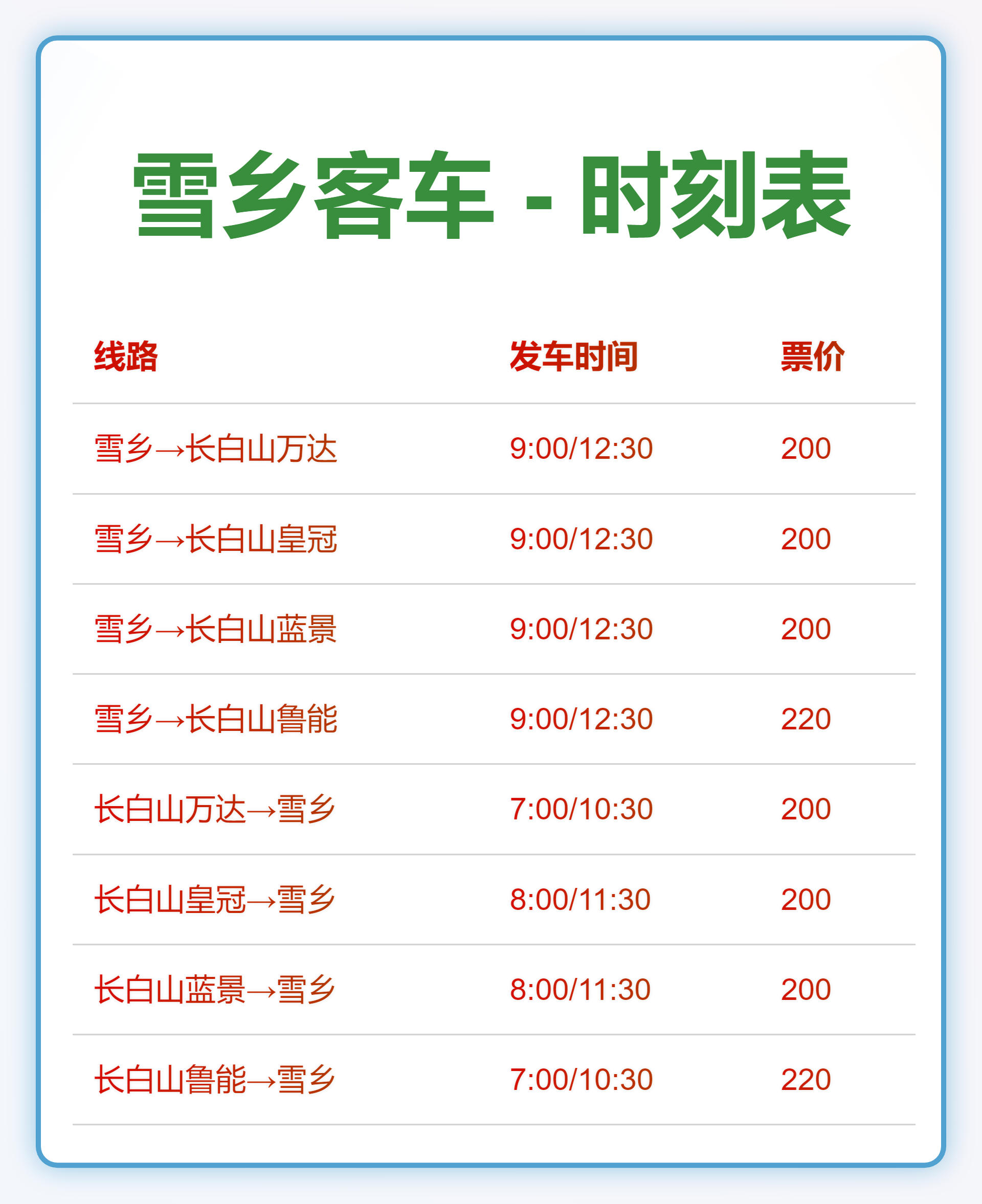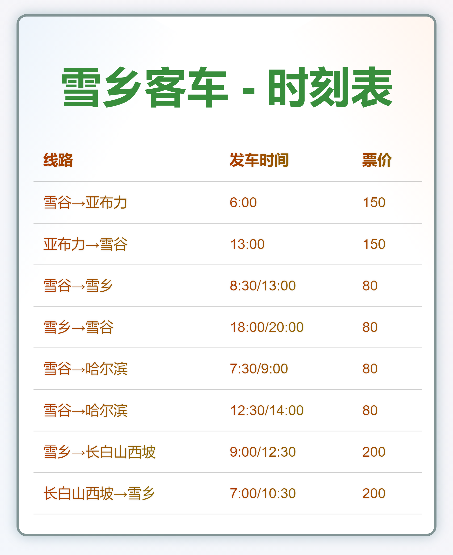 雪乡交通概况: 无高铁、无火车直达。 可选方式:景区直通车、拼车、包车。 ----------- 一、出发地 -> 雪乡/雪谷 (直通车) ----------- 【从哈尔滨出发】 往雪乡:06:00 / 08:30 | 中央大街上车 | 90元 往雪谷:08:00 / 13:00 | 中央大街上车 | 80元 套票:08:00出发,20:00转往雪谷(省住宿费) | 180元 【从亚布力出发】 往雪乡:10:30 | 亚布力青山村上车 | 80元 【从延吉/长白山出发】 延吉 -> 雪乡:09:00 / 12:30 | 网红墙上车 | 120元 北坡 -> 雪乡:09:00 / 12:30 | 璞悦酒店上车 | 120元 西坡 -> 雪乡:07:00 / 10:30 | 小车上门接 | 200元 【从长春/吉林出发】 吉林 -> 雪谷:14:00 | 客运站上车 | 120元 长春 -> 雪谷:12:30 | 龙嘉机场上车 | 230元 ----------- 二、返程线路汇总 ----------- 【从雪乡出发】 雪乡 -> 哈尔滨:08:00 / 12:30 (90元) 雪乡 -> 延吉:09:00 / 12:30 (120元) 雪乡 -> 亚布力西站:08:00 (80元) 雪乡 -> 雪谷:18:00 / 20:00 (80元) 雪乡 -> 长白山:09:00 / 12:30 (120-220元) 【从雪谷出发】 雪谷 -> 哈尔滨:07:30 / 09:00 / 12:30 / 14:00 (80元) 雪谷 -> 雪乡:08:30 / 13:00 (80元) 雪谷 -> 吉林:07:00 (120元) 雪谷 -> 长春机场:07:00 (230元) 雪谷 -> 亚布力:06:00 (150元) ----------- 三、包车参考价格 (单程) ----------- 亚布力 ↔ 雪乡:5座400元 / 7座600元 / 9座900元 哈尔滨 ↔ 雪乡:5座600元 延吉/二道白河 ↔ 雪乡:5座1200元 ----------- ★ 贴心提示: 东北雪天路滑,建议行程预留充足缓冲时间。 旺季建议提前1-2天通过正规渠道订票。